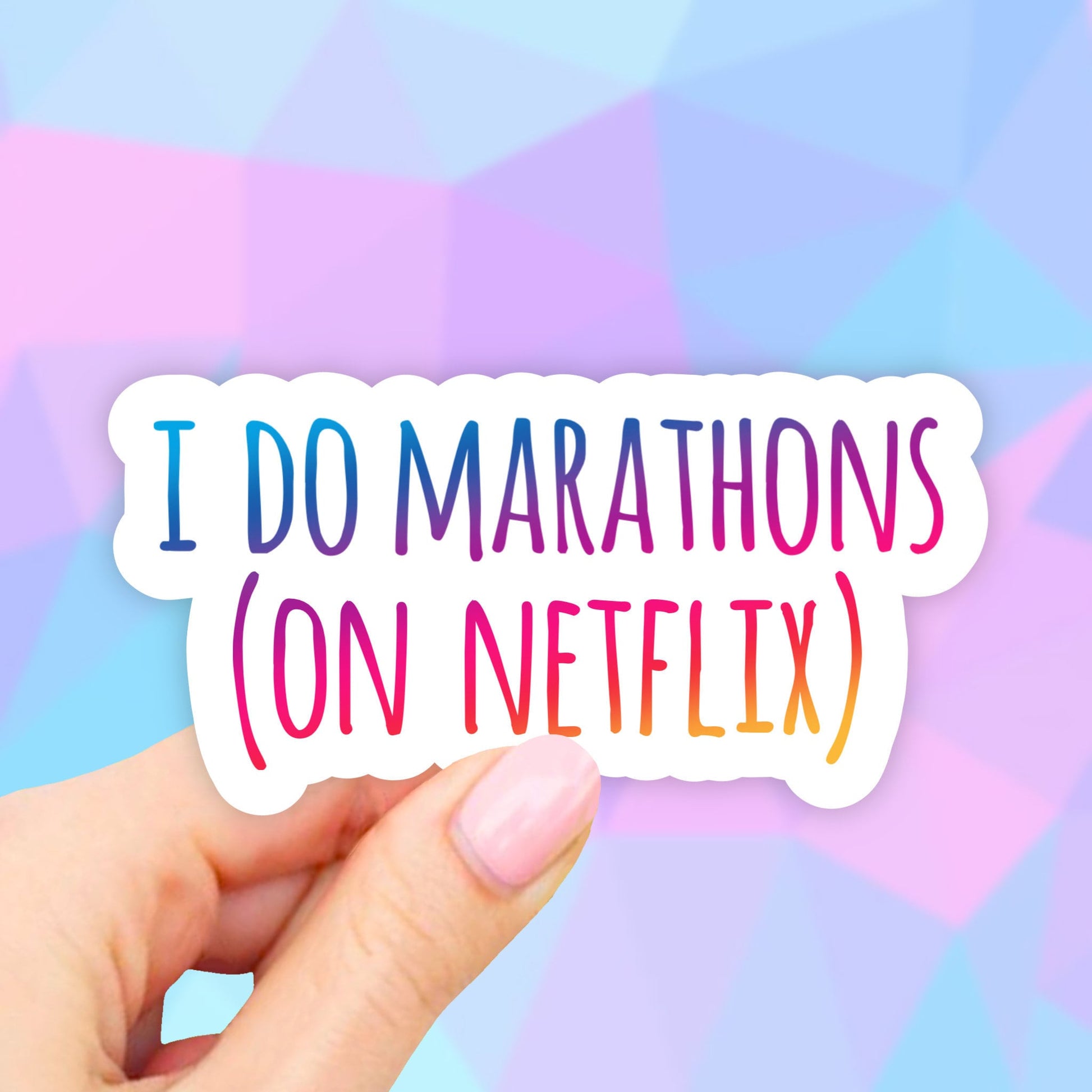 I Do Marathons On Netflix Sticker:: These waterproof vinyl stickers are a perfect way to customize your laptop, water bottle, computer, car window, bible journal, planners and more. We have a huge collection of sarcastic stickers, motivational stickers, dog mom and cat mom stickers, religious faith stickers, inspirational quotes decal, plant and nature, history, travel, science, occupational and most importantly our adorable animal collections and many cute varieties of random stickers. Can’t wait to make your stickers extra special with love and care in our little home studio.